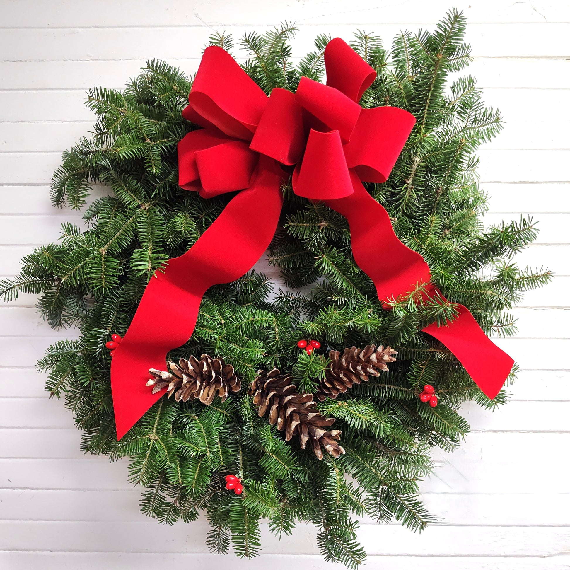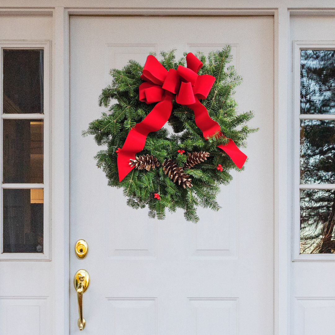 This classic 22", double-sided wreath features fresh Maine balsam, accented with natural pinecones and bright berries. Finished with a festive red velvet bow, it adds a warm and timeless touch to your holiday décor. Perfect for creating a welcoming atmosphere throughout the season.