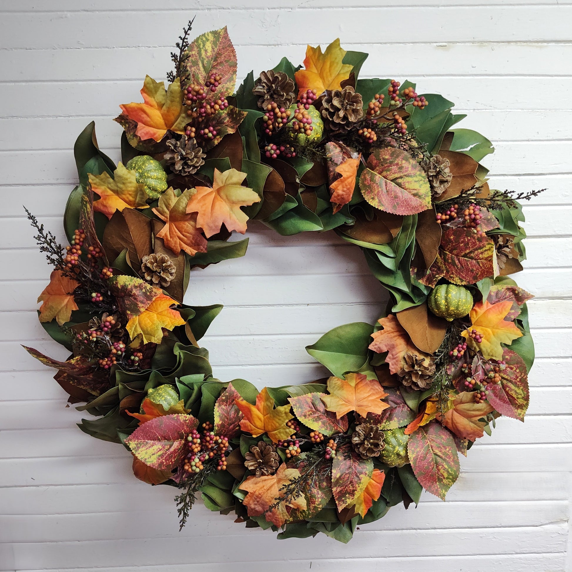 Add a touch of autumn charm with our 28" Magnolia Wreath! Featuring a lush magnolia leaf base adorned with vibrant fall leaves and rustic pine cones, this playful piece brings seasonal warmth and natural beauty to your door or wall. Perfect for welcoming guests with a cozy, festive vibe.